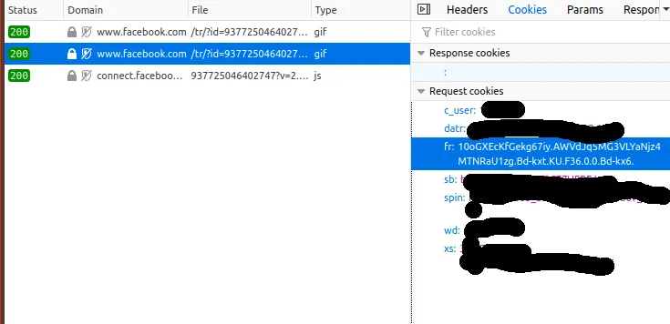 在我浏览这个商品的同时,页面上运行的 Javascript(用的应该是这段代码)向 facebook.com 发送了一个请求。在开发者工具中,该请求看上去是这样的:(我屏蔽了大部分 cookie 值,因为其中有一些是我的登录 cookie)
