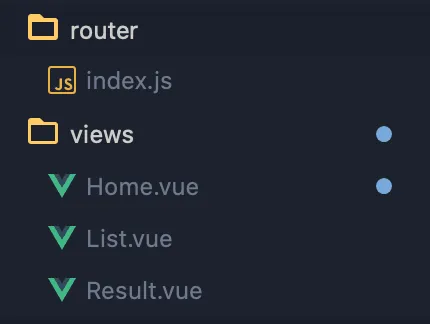 在思考情况后,接下来我们来创建 Router 和 Page。首先,删除 views 下的 About.vue(因为这个页面我们不需要)。然后创建 List.vueResult.vue ,用作后续的开发准备。
