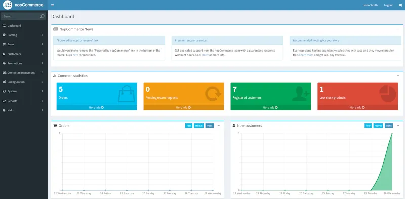 nopCommerce 的管理面板界面具有简洁易用的特点,如果你还使用过 OpenCart,就可能会感到似曾相识(我不是在抱怨)。在默认情况下,它就已经自带了很多基本的功能,同时还为移动端用户提供了响应式的设计。