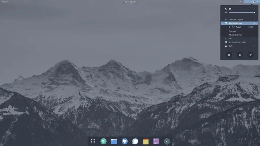 一旦安装了这两个组件,就可以配对两个设备。安装扩展后它在你的系统菜单中显示为“ 移动设备 ”。单击它会出现一个下拉菜单,你可以从中访问“ 移动设置 ”。