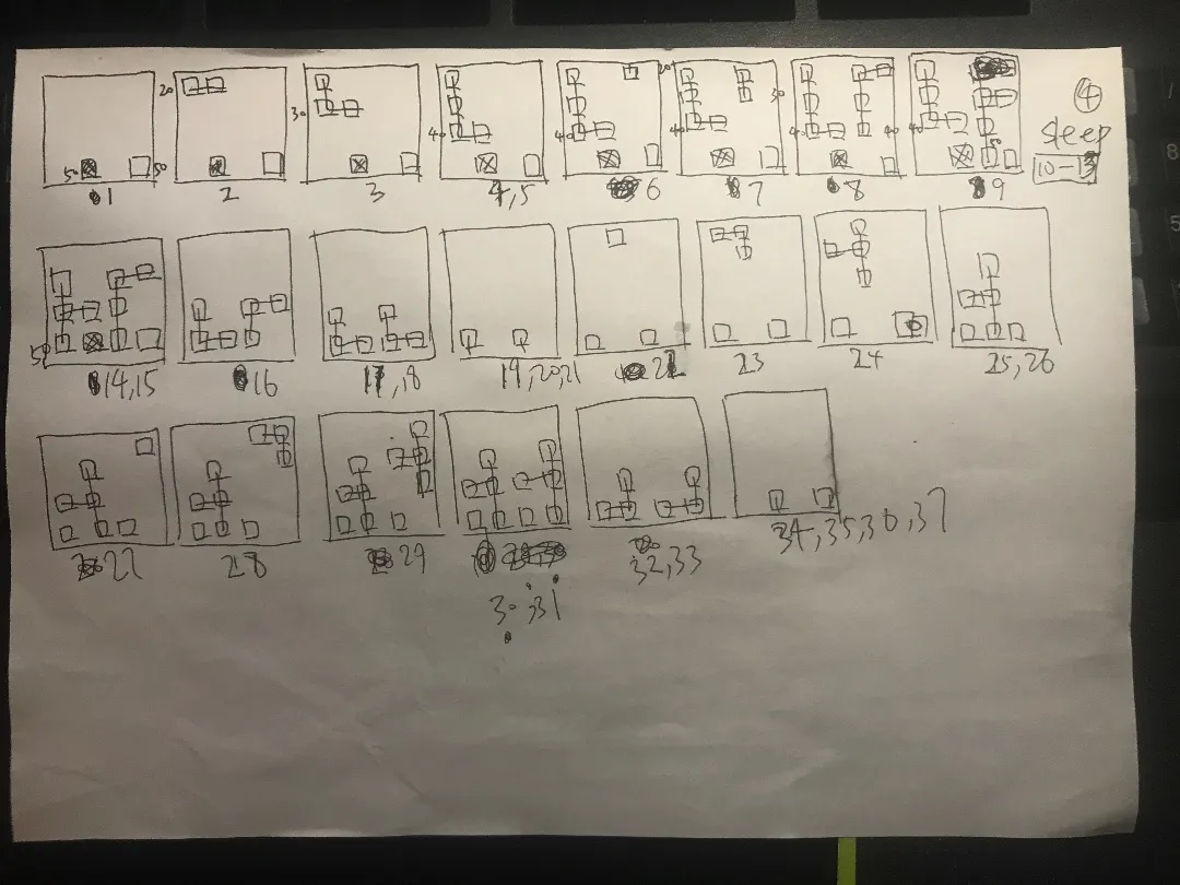 终于,能自己动了。但是又发现,这动画真是一帧一个状态啊,怎么计算呢?这个时候感觉自己的脑力不够了,于是就找张纸开始画分镜头图,反反复复地画了好几张。这是最终定稿的一张,就这也经过了大量涂改。