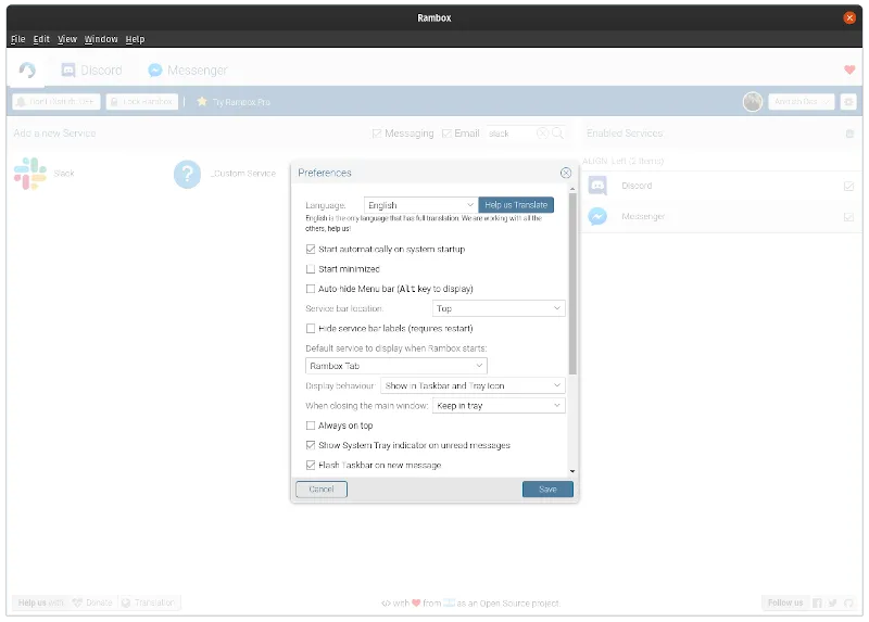 Rambox 是一个多合一消息收发工具,允许你将多种服务(如 Discord、Slack、Facebook Messenger)和数百个此类服务结合在一起。