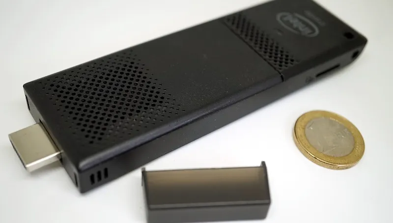 一个英特尔电脑棒。欧元硬币大小。
