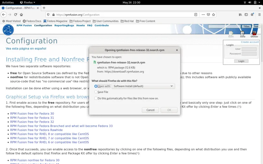 如果你使用 Firefox,那么还可以从浏览器添加 RPMFusion 仓库。进入这个配置页面,然后向下滚动到 “Graphical Setup via Firefox web browser”。单击自由和非自由仓库的链接。这将下载 .rpm 文件,并安装仓库。