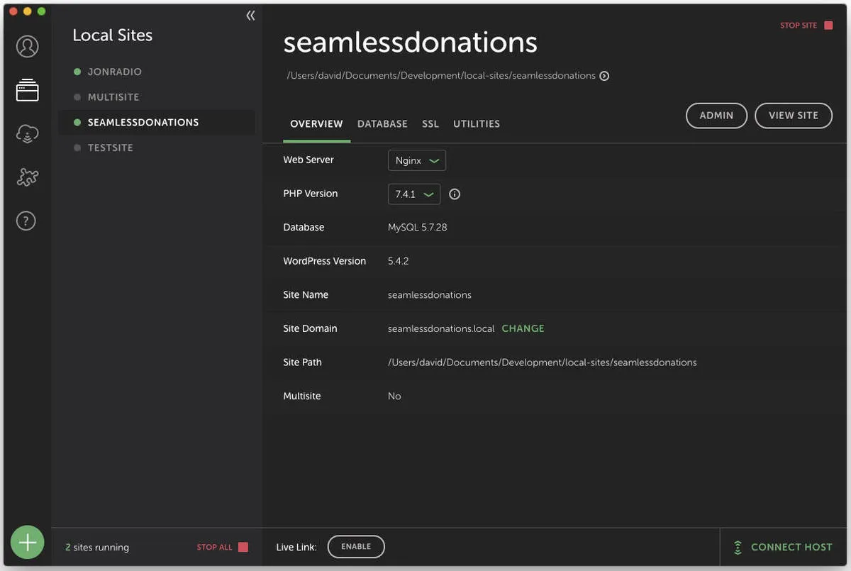 在做 Web 开发时,通常最好有一个本地开发栈。Local 就是这样一个栈。它提供了 Nginx 或 Apache、MySQL、带有 Xdebug 的 PHP 安装包,以及其他一些资源,最重要的是它带有一个隧道,这样基于互联网的资源就可以访问本地环境进行编码和测试,内置了 SSL 集成,以及 MailHog —— 它可以拦截电子邮件,用于基于电子邮件的应用测试。哦,而且是免费的。