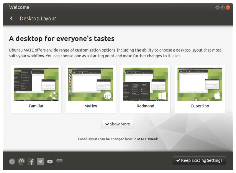 此外, MATE Tweak 也得到了一些贴心的改进,即使你更改桌面的布局,也可以保留用户偏好。新的 MATE 欢迎屏幕也会告知用户更改桌面布局的能力,因此,用户无需不断摸索就能知道这个变化。
