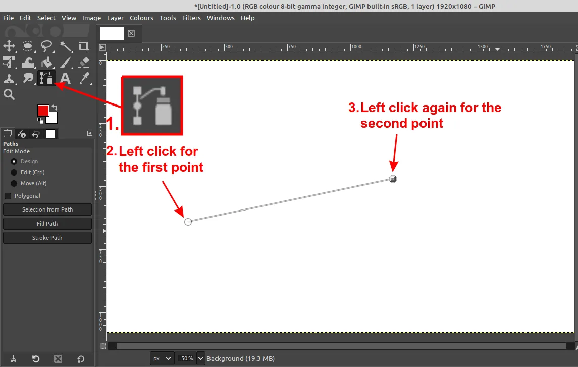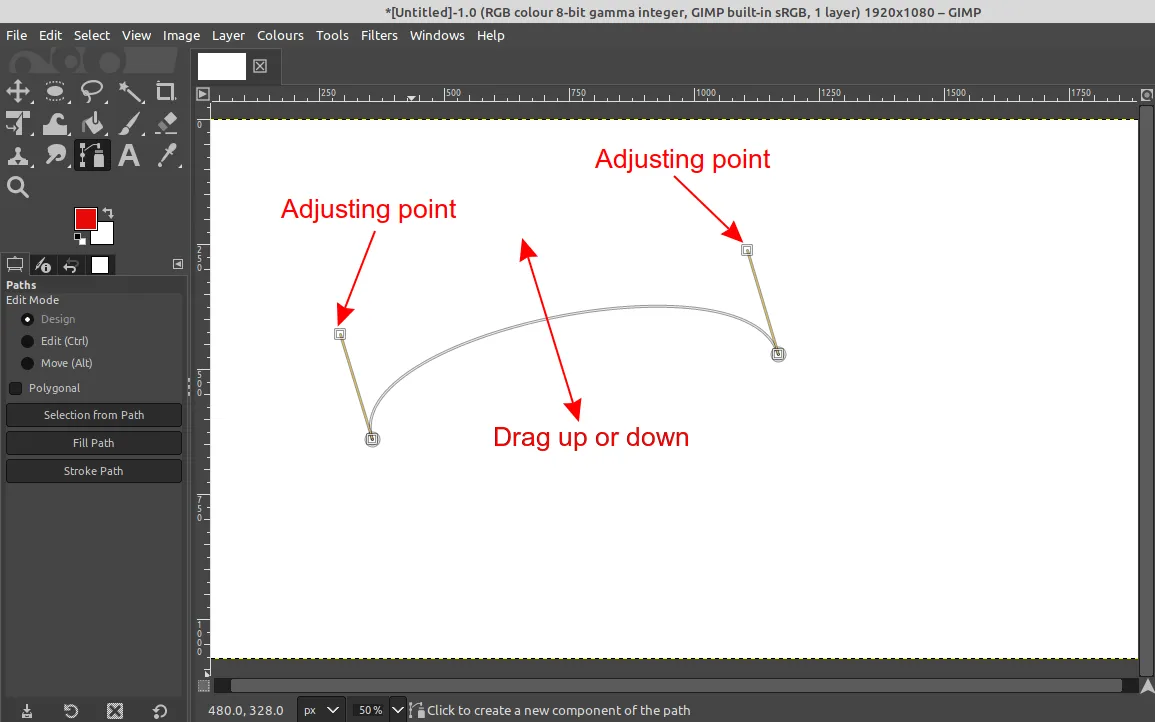 创建一个新的图像或打开一个现有的图像。选择 “工具 -> 路径”,然后大致考虑曲线文本的位置,通过分别单击路径点的开始点和结束点来创建路径。