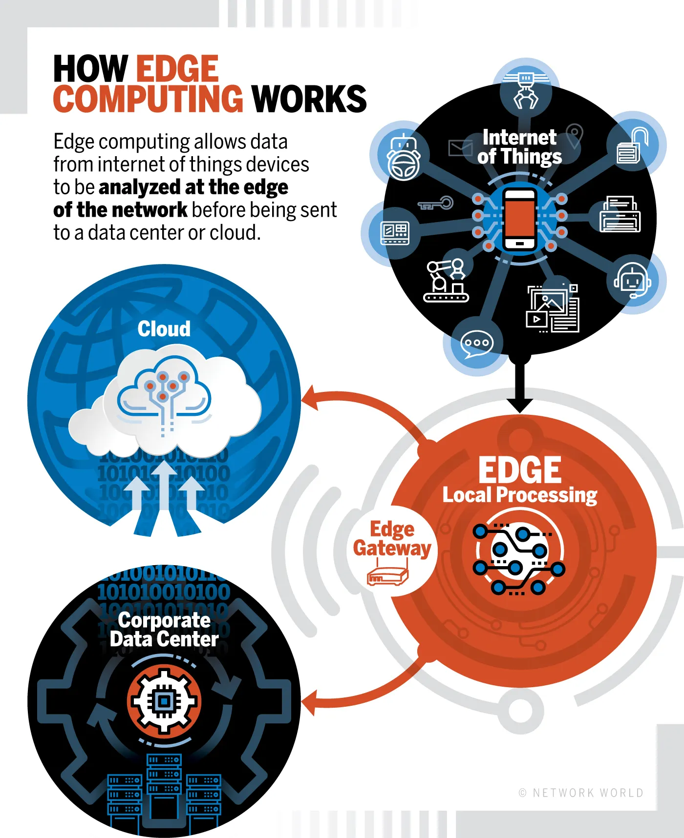 处理数据可以在数据中心或者云端进行,但是有时候这不太可行。对于一些非常重要的设备,比如说工业领域的关停设备,从设备上将数据发送到远程数据中心的延迟太大了。发送、处理、分析数据和返回指令(在管道爆炸之前关闭阀门)这些操作,来回一趟的时间可能要花费非常多的时间。在这种情况下, 边缘计算 就可以大显身手了,智能边缘设备可以汇总数据、分析数据,在需要的时候进行回应,所有这些都在相对较近的物理距离内进行,从而减少延迟。边缘设备可以有上游连接,这样数据就可以进一步被处理和储存。