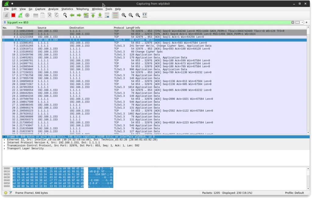 它会询问你在哪个设备上捕获数据包。在我这里,因为我使用无线接口,我用的是 wlp58s0。在 Wireshark 中设置筛选器,tcp.port == 853(853 是 DNS over TLS 协议端口)。在捕获 DNS 查询之前,你需要刷新本地 DNS 缓存: