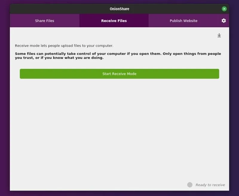 如果你想生成一个 URL,让别人直接上传文件到你的电脑上(要注意你与谁分享),你可以在启动 OnionShare 后点击 Receive Files 标签即可。