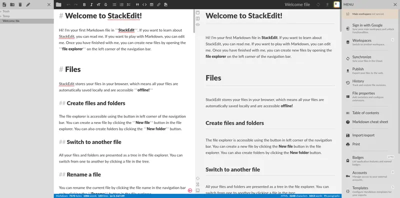 它提供了一个很好的用户界面,并有一堆有用的功能。协作能力、同步能力,以及能够将你的文件发布/保存到 Blogger、WordPress、GitHub 和其他一些服务是 StackEdit 的一些关键功能。
