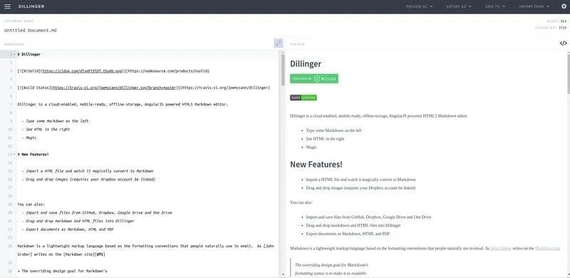 Dillinger 也是一个有趣的开源在线 Markdown 编辑器。与 StackEdit 类似,你也可以与 Dropbox、GitHub、Medium、Google Drive、Bitbucket 和 OneDrive 链接并保存文件。