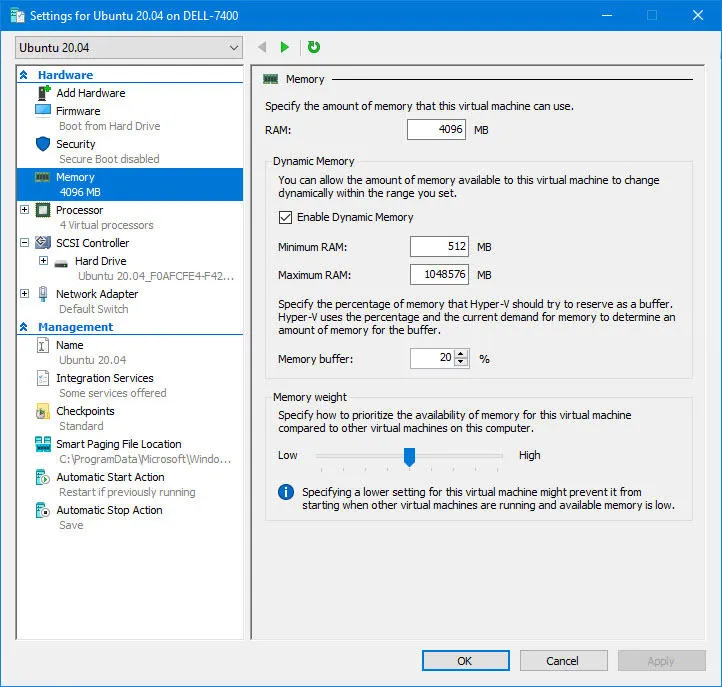 从新虚拟机的硬件列表中选择“内存”,然后将分配的 RAM 从其默认值 2048 改为 4096,这应该会带来更好的性能。如果你想要一个固定数量的虚拟内存,你也可以禁用动态内存。你可能还希望将系统磁盘的大小从其默认的 12GB 提升到更多。单击“硬盘驱动器”,然后单击“编辑”,并按照提示操作,直到进行到“扩展”命令那一步。