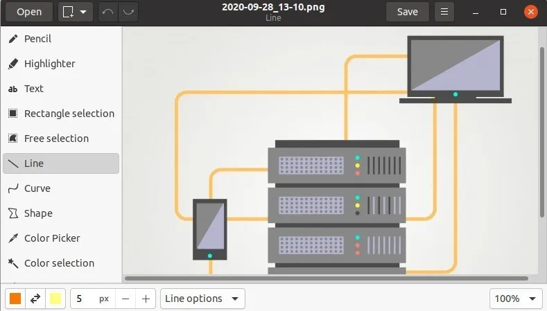 Drawing 是一个基本的图像编辑器,就像微软画图一样。有了这个开源的应用,你可以画箭头、线条、几何图形、添加颜色和其他你期望在普通绘图应用程序中做的事情。