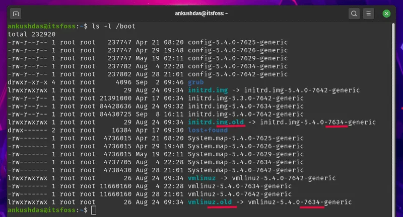 在上面的屏幕截图中,我已经指出了我系统上的当前内核和旧内核,因此你必须注意你系统上的内核。