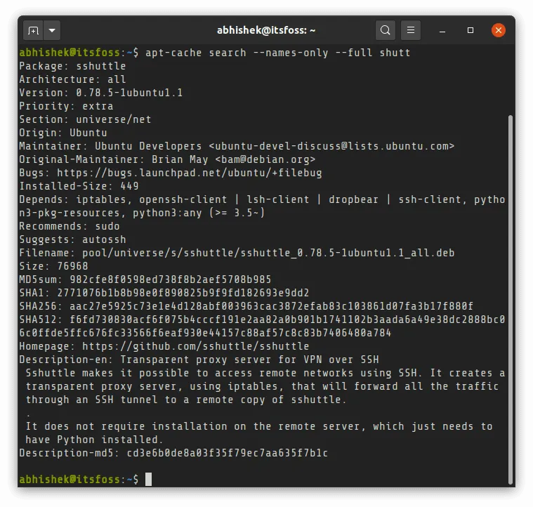 你可以看到软件包元数据中的所有细节,比如名称、版本、开发者、维护者、仓库、长短描述、软件包大小甚至是校验和。