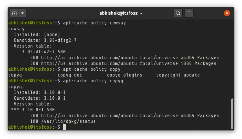 如果你指定了软件包的名称,它将显示该软件包是否已经安装,在哪个版本的仓库中可用,以及它的优先级。