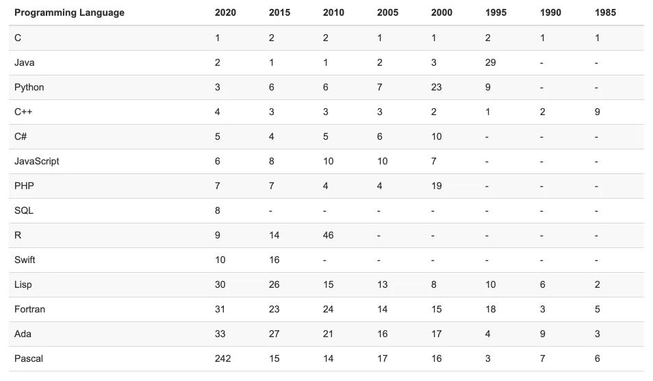 但正如 Perl 今天所显示的那样(它在 Tiobe 指数中排名第 12 位),即使是曾经在某些开发者社区中大受欢迎的语言,也会相对迅速地衰落。