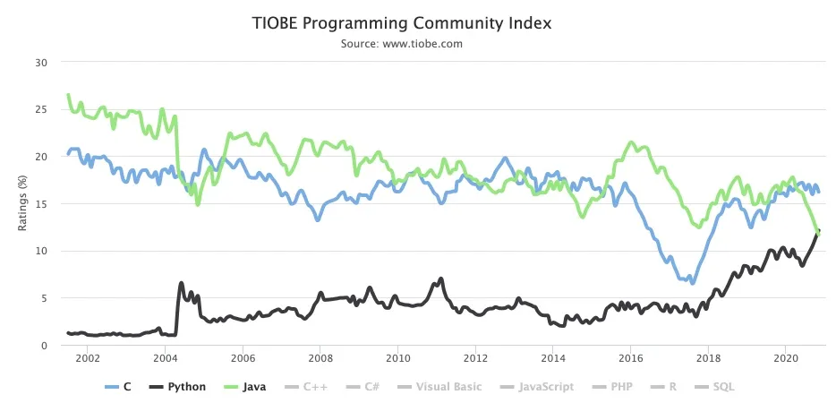 在最新的 Tiobe 指数中,数据科学和机器学习项目的首选语言 Python,现在排名仅次于 C 语言,排在第二位,将 Java 打落到第三位。