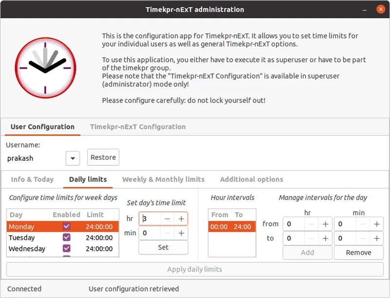 再说一次,不要在主账户中使用 Timekpr-nExt。你可能会把自己锁在外面。