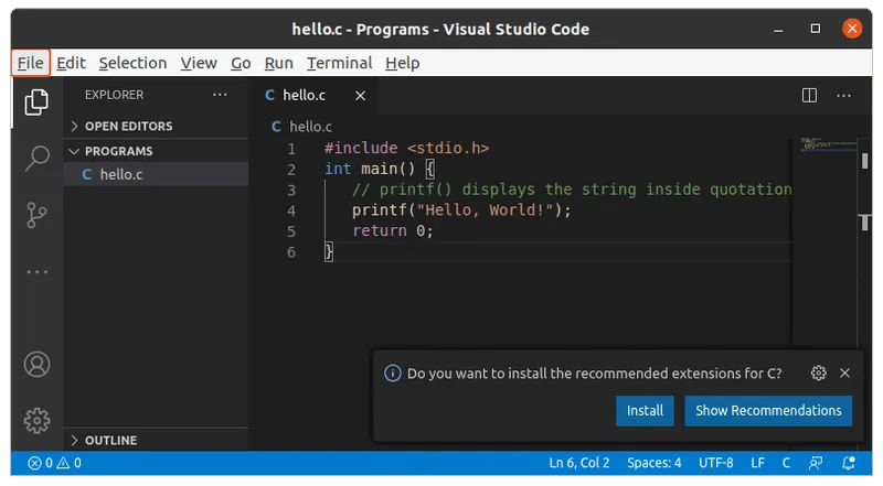 当你运行这个 C 程序时,它将会被自动编译和运行。你可以在编辑器底部打开的终端中看到输出。还有比这更好的事情吗?