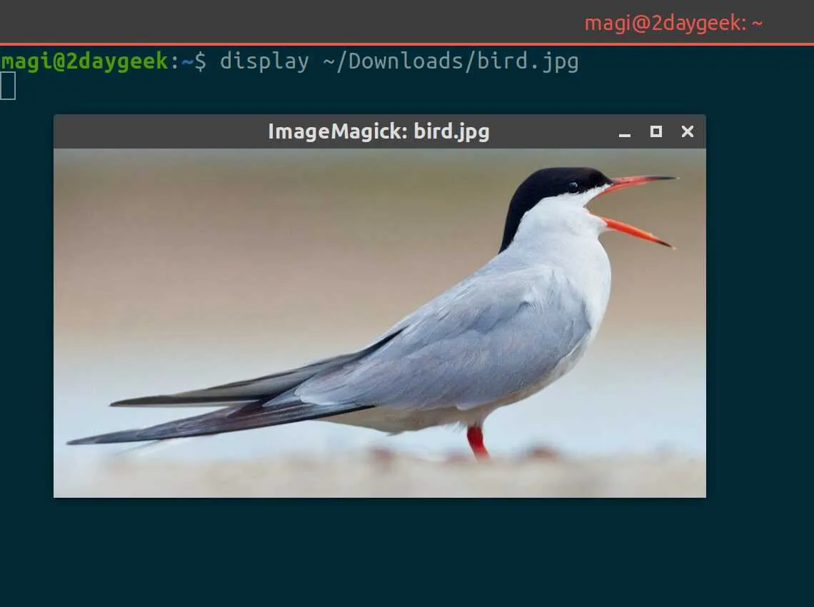 幸运的是,在使用 ImageMagick 工具时,我得到了一个从终端查看图像的命令。命令名是 “display,它是 ImageMagick 工具的一部分。这是一个很好的工具,允许类 UNIX 用户从终端查看图像。