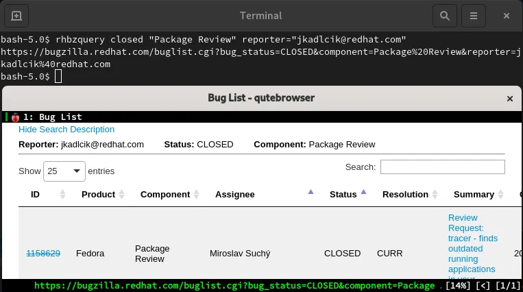 rhbzquery 是一个简单的查询 Fedora Bugzilla 的工具。它提供了一个指定搜索查询的界面,但它并不在命令行中列出结果,而是由 rhbzquery 生成 Bugzilla 的 URL,并在浏览器中打开。