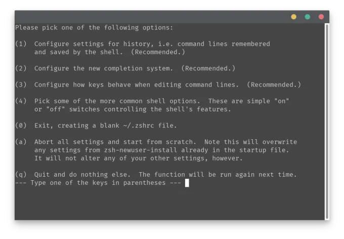 1:设置命令历史记录相关的选项2:设置命令补全系统3:设置热建4:选择各种常见的选项,只需要选择“On”或者“Off”0:退出,并使用空白(默认)配置a:终止设置并退出q:退出