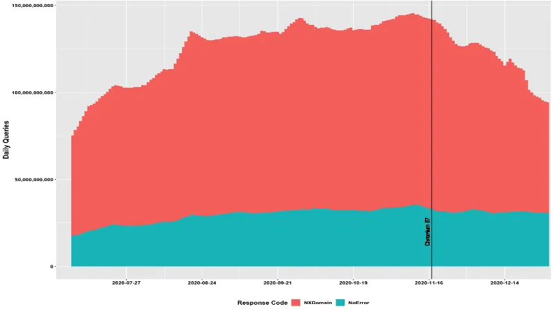 此后,Chromium 团队重新设计了代码,在 Android 设备上禁用了重定向测试,并推出了多状态 DNS 拦截策略,支持禁用桌面浏览器的重定向测试。该功能在 2020 年 11 月中旬上线后,据统计,对根服务器的 DNS 查询量迅速下降。在新版本发布之前,根服务器系统的查询量峰值为每天约 1430 亿次。此后,流量已降至每天约 840 亿次查询。