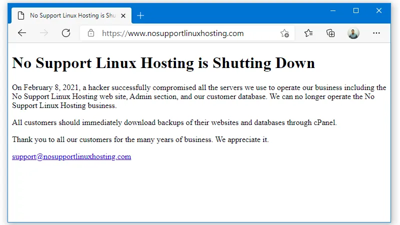 这家名为“No Support Linux Hosting(无支持 Linux 托管)”的 Web 托管公司是一家成立了 11 年的公司,以不提供技术支持而降低托管费用。该公司称其在 2 月 8 日被入侵。黑客似乎已经入侵了该公司的整个运营系统,包括其官方网站、管理部分和客户数据库。该公司称无法继续运营,“所有客户应立即通过 cPanel 下载网站和数据库的备份。”目前尚不清楚黑客攻击的目的是为了破坏还是勒索。