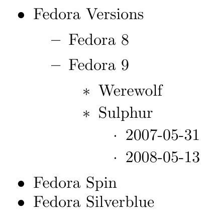 要创建一个列表,需要在每个项目前加上控制序列 item,并在项目清单前后分别加上控制序列 begin{<类型>} 和 end{<类型>}(将其中的<类型>` 替换为将要使用的列表类型),如下例:
