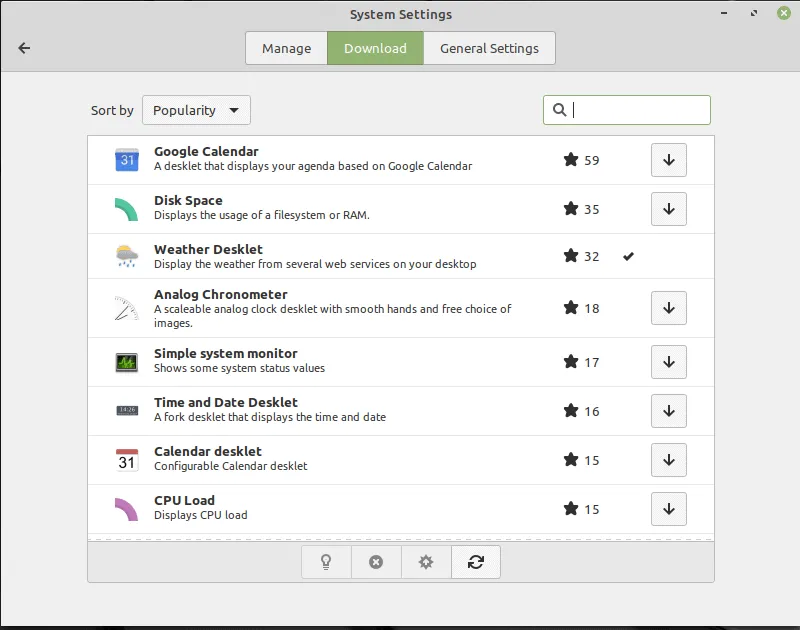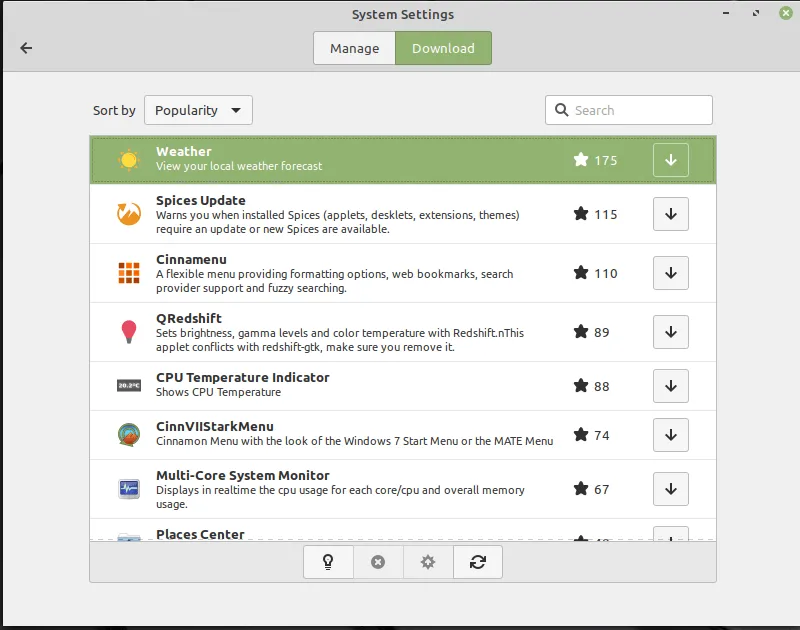 Cinnamon 小程序是所有包含在底部面板的元素,如日历或键盘布局切换器。在管理选项卡中,你可以添加/删除已经安装的小程序。