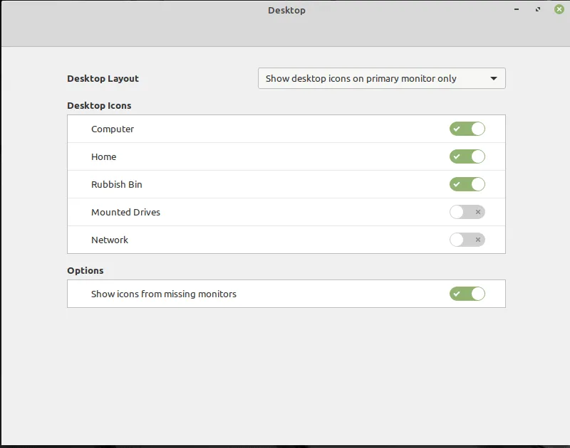 此外,如果你点击“桌面设置”,将显示更多的选项。你可以禁用桌面上的图标,将它们放在主显示器或副显示器上,甚至两个都可以。如你所见,你可以选择一些图标出现在桌面上。
