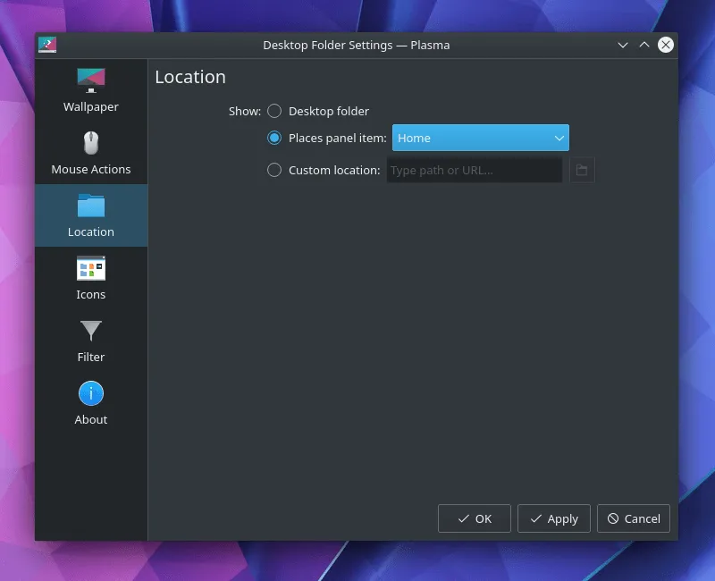 只有在壁纸选项卡中选择“文件夹视图”时,该选项才可用。默认情况下,桌面上显示的内容是你在主目录下的“ 桌面 ”文件夹中的内容。这个位置选项卡让你可以选择不同的文件夹来改变桌面上的内容。