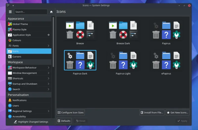 系统图标样式对桌面的外观有很大的影响。无论你选择哪一种,如果你的全局主题是深色的,你应该选择深色图标版本。唯一的区别在于图标文字对比度上,图标文字对比度应该与面板颜色反色,使其具有可读性。你可以在系统设置中轻松访问“ 图标 ”标签。