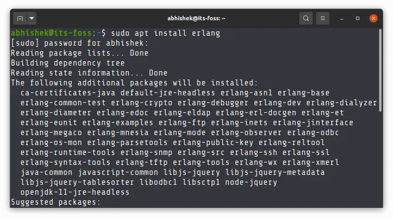 你会注意到,它建议你进行一些升级。如果你列出了可用的升级,你会在那里找到 erlang 包。要更新现有的 erlang 版本或重新安装,使用这个命令: