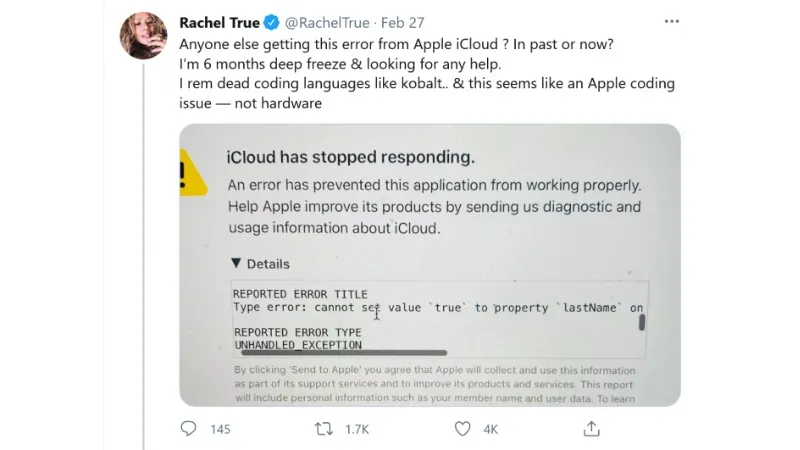 据国外媒体报道,当事人 Rachel True 在 Twitter 上抱怨称自己无法登录 iCloud 账号已有 6 个月。从她贴出的报错诊断信息上可以看到,上面写着“iCloud 已停止响应”,并提到用户不能将 true 值设置值为姓氏。这显然是将字符串“true”当成布尔值处理了。目前该问题尚未得到解决。