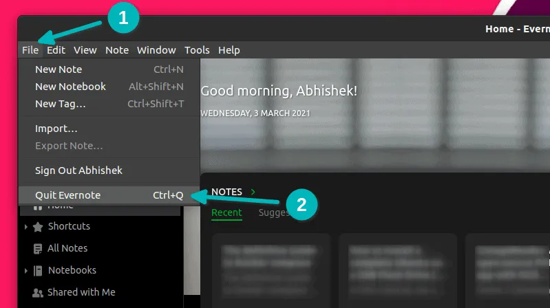 那么,如何退出 Evernote 应用呢?为此,再次打开 Evernote 应用。如果它在后台运行,在菜单中搜索它,并启动它,就像你重新打开它一样。