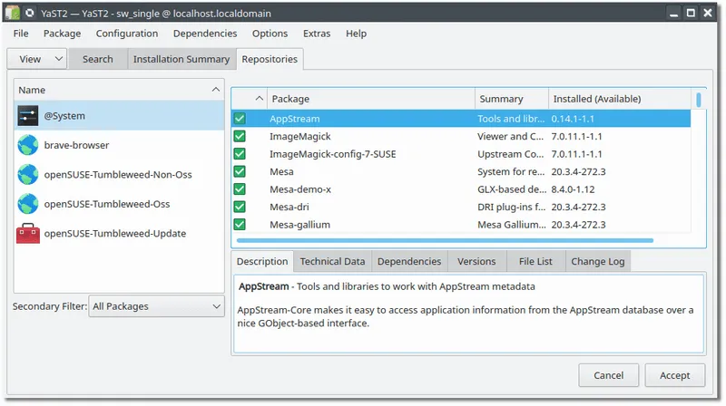 还有一个 YAST 软件管理 GUI 工具,你可以用它来对软件包管理进行更精细的控制。