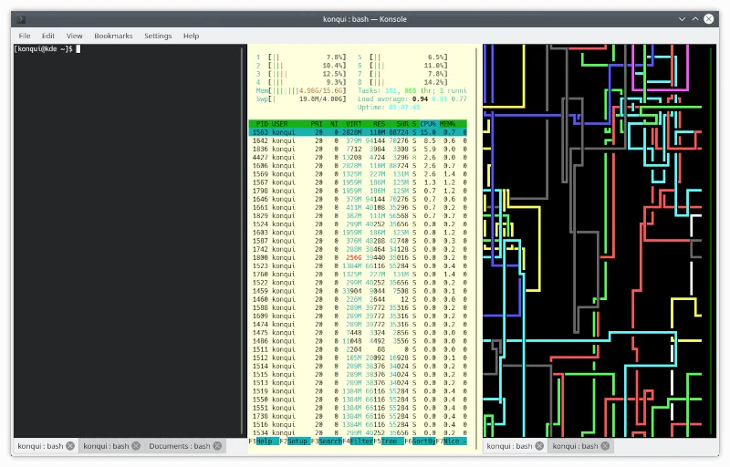 不仅如此,它还集成了很多 KDE 应用。即使你使用的是其他的桌面环境,你也可以试试 Konsole。它是一个轻量级的终端仿真器,拥有众多的功能。