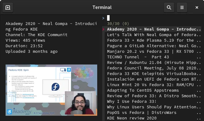 目前仓库为 Fedora 33 和 34 提供 Ytfzf。要安装它,请使用以下命令: