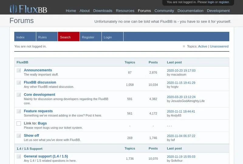 FluxBB 是另一个简单、轻量级的开源论坛。与其他的相比,它可能维护的不是非常积极,但是如果你只想部署一个只有很少几个用户的基本论坛,则可以轻松尝试一下。