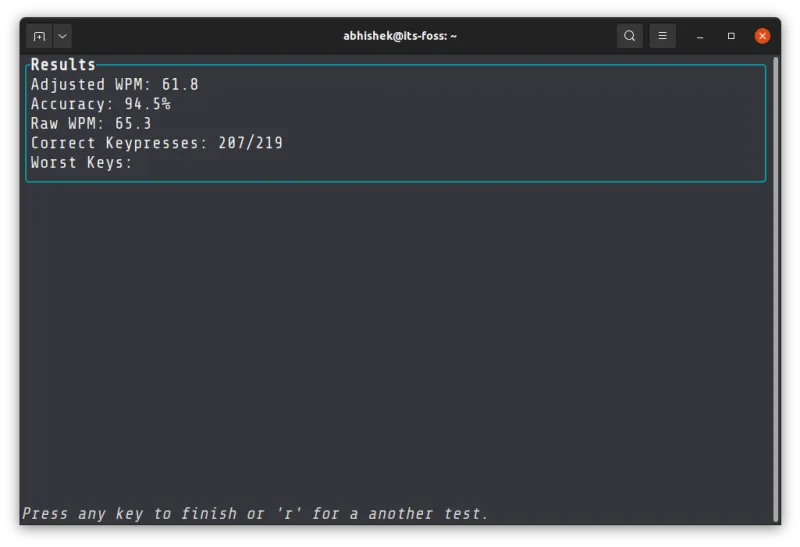 当你打完所有显示的单词后,你会得到你的打字速度(每分钟字数)、准确率和正确按键数的结果。如果你没有心情打完全部,你可以使用 Ctrl+C 退出 Ttyper。