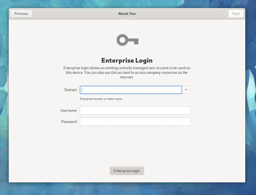 要加入域网络,你需要域管理员的权限才能添加计算机。可以通过在域凭据上设置特殊权限或代表你对该计算机进行预配置。Fedora Linux 有一个在安装时配置机器的选项,叫做 企业登录 。如果你的计算机网络自动配置为企业域网络,那么你可以直接使用域凭据登录。