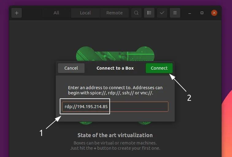 首先,启动 GNOME Boxes,并点击 “+” 号,选择 “连接到远程计算机…”。