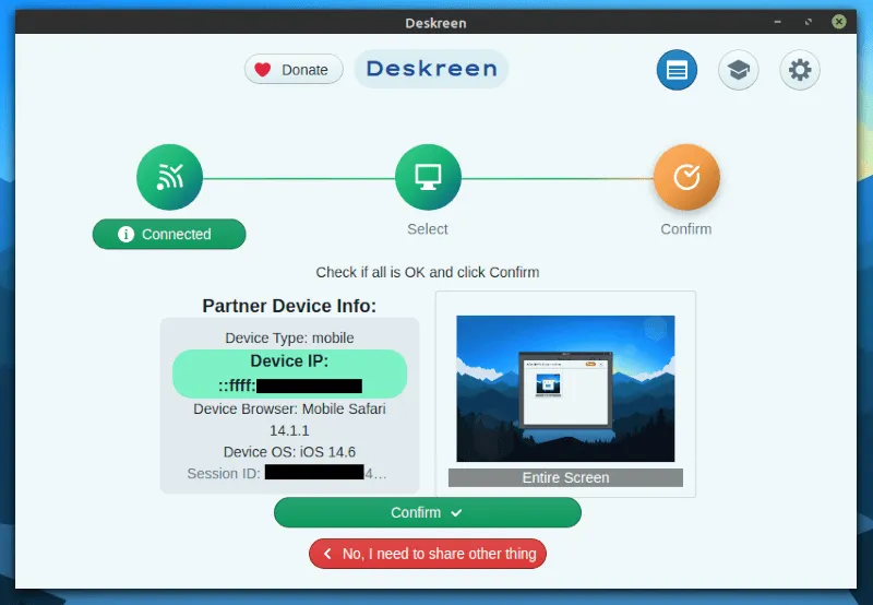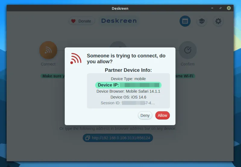 当你扫描二维码或在浏览器的地址栏中输入 IP 地址,你会在 Deskreen 应用上得到一个提示,允许或拒绝连接。除非是你不认识它,否则就允许吧。