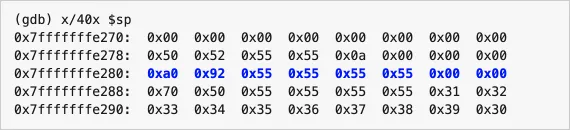 这些字节实际上应该是从右向左读:因为 x86 是小端模式,因此,heap_string 中所存放的内存地址 0x5555555592a0