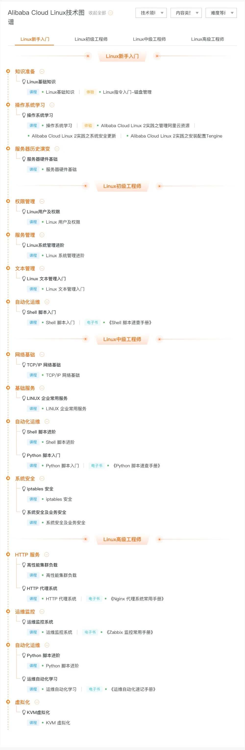 这份《**Linux 技术图谱》涵盖了《Linux 基础知识》、《服务器硬件基础》、《**Linux 系统管理进阶》**、《Linux 企业常用服务》、《高性能集群负载》等共计 19 门课程,11 门在线实验室和 5 本电子书,4 门线上学习训练营内容**,涉及到在技术工作中的绝大多数场景,可以帮助你更好的完成自己的学习和工作。