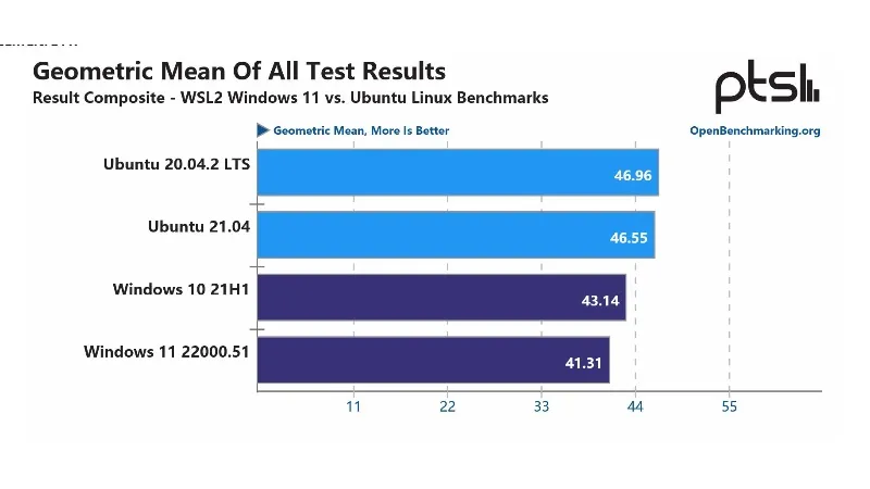 近日,外媒 Phoronix 对 Windows 11 的 WSL2 的性能进行了测试。测试表明,对于 CPU 敏感的工作负载,WSL2 的性能与 Ubuntu Linux 本身相当。但在一些情况下,Windows 11 的 WSL2 实现还不如 Windows 10 下的性能好,当然,估计 Windows 11 正式推出时会有改善。尤其是当涉及到 I/O 时,WSL2 的性能往往比裸机 Linux 慢得多,但至少比原来的 WSL1 性能好。