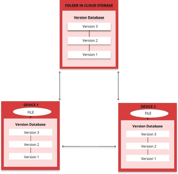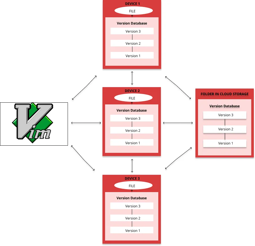 上图是我们如何进行传统版本控制的一个说明。这个图中假设你有一台设备,而且你只在那台设备上写作。但对我而言,我在许多机器上写作,包括我的安卓手机和一些不同年代的笔记本电脑,我会在特定的任务、特定的位置使用到它们。我在所有这些设备上进行的一个共同任务就是写作 —— 因此,我的设备必须以合理的方式捕捉变化并控制文件的版本。不要再让我将 file1V1_device1_date.doc 作为文件名了。